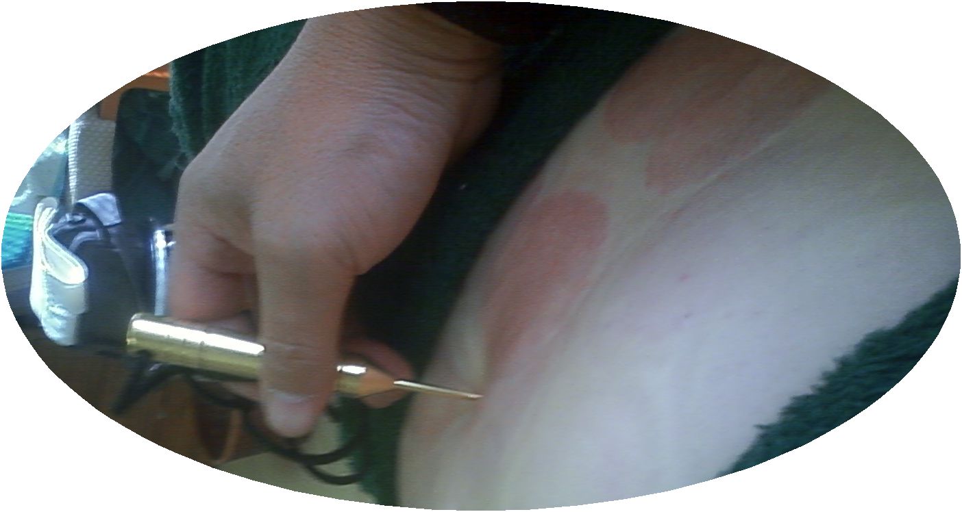 そこで、理事長に妻の手当をして貰うことにしました。理事長は二本のレインボーパワー取り出して、両耳のくぼんだ耳黄穴(じこうけつ)に一分近く押し当てられました。